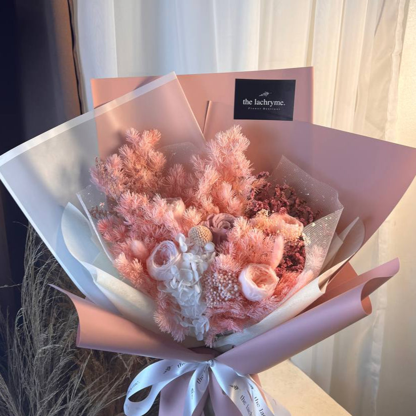 Composed of two (2) preserved Ecuadorian roses, four (4) preserved peony, and dried flower fillers for a classy and deluxe bouquet.
