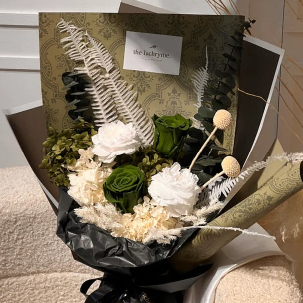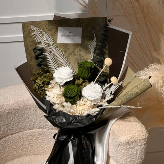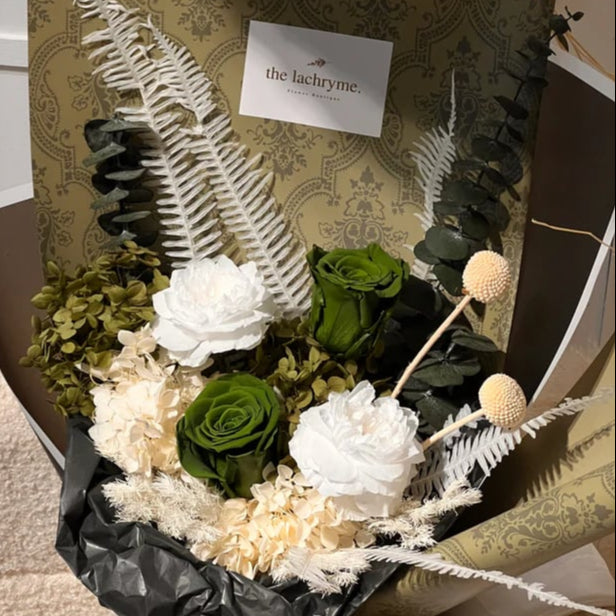 An elegant dried flower bouquet featuring velvety white peonies symbolizing refined beauty, rare green roses adding a touch of mystery, and deep black accents for bold sophistication.