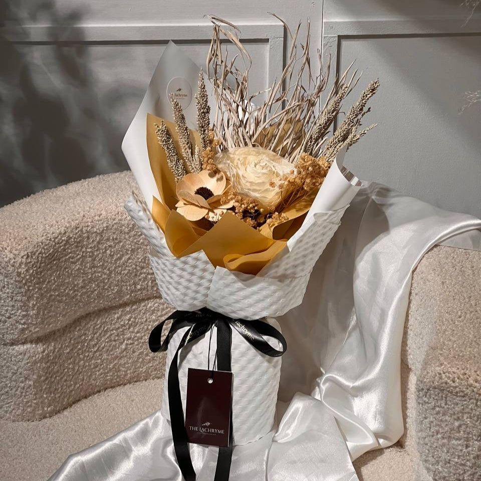 This bouquet features one (1) Fossilized Rose, one (1) Wooden Bloom, and a delicate mix of dried flower fillers — thoughtfully arranged for a lasting impression.