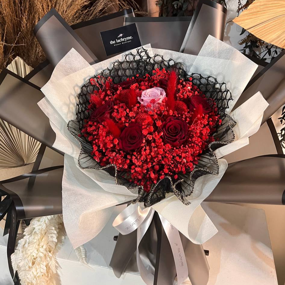nspired by the passionate devotion of Romeo, this luxurious bouquet captures the essence of eternal love. Composed of seven preserved Ecuadorian roses and elegant dried flower fillers, it’s a poetic tribute to love that transcends time—bold, tender, and forever true.